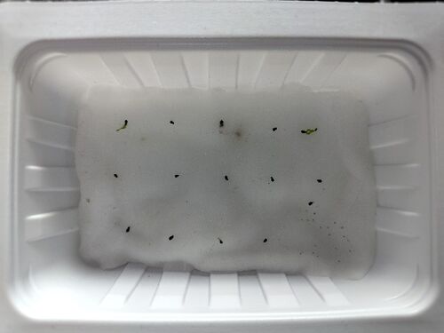 全体的に変化無し。 中央上の種、脱脂綿が黒くなっているのはカビではなかろうかと思えてきた。 種中央に白い曲線が見える。ここが割れて芽か根が出てほしい。